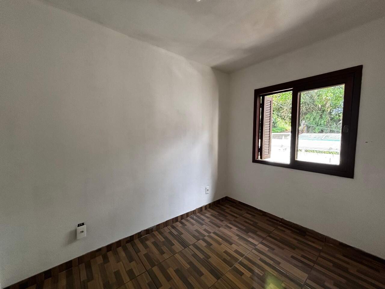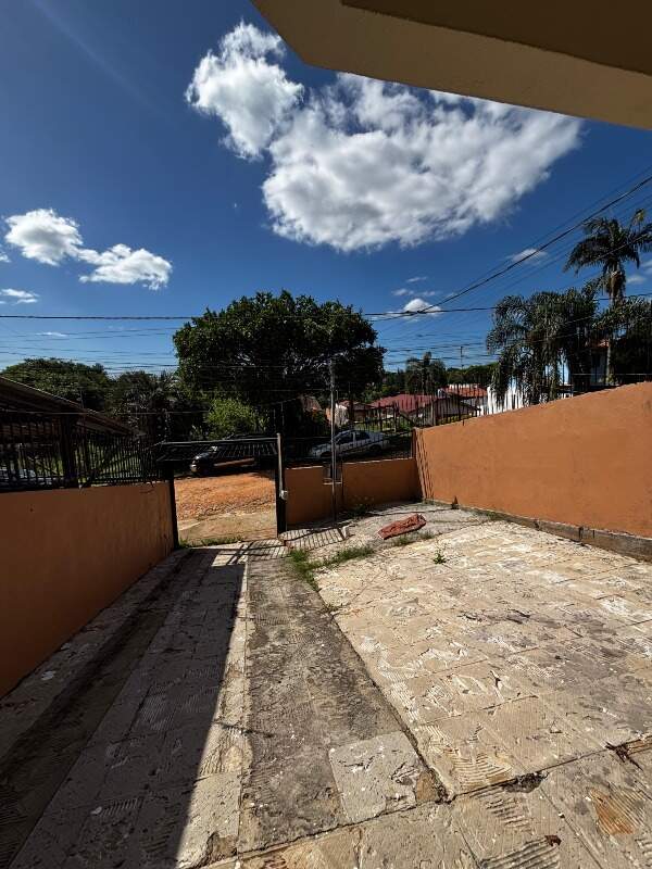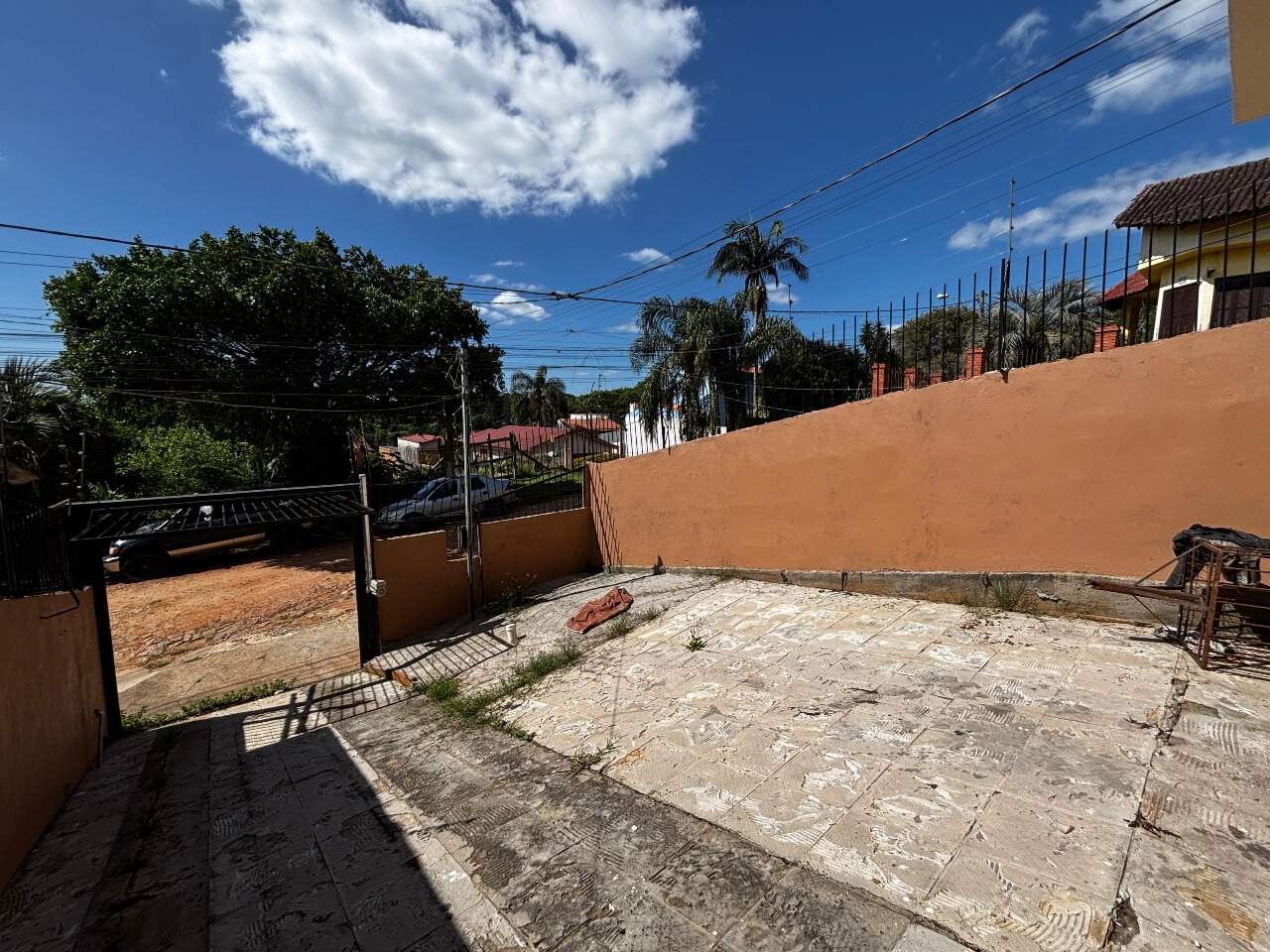 Pátio em frente com capacidade para dois carros, área coberta com churrasqueira e lavanderia.