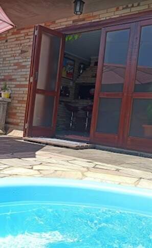 Área Gourmet com churrasqueira, banheiro e piscina.