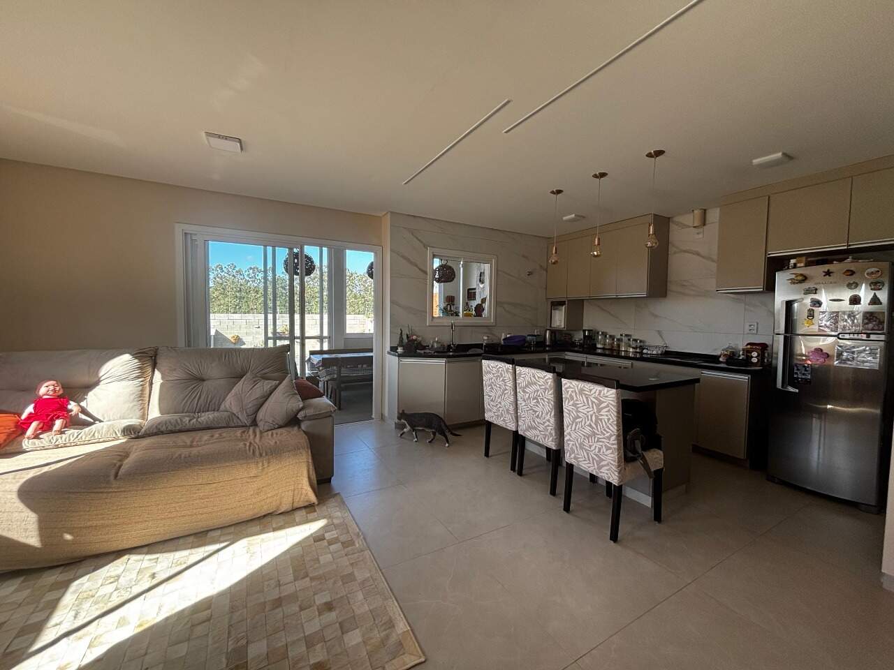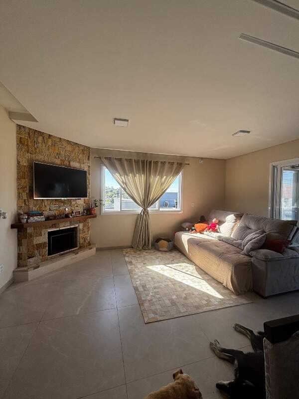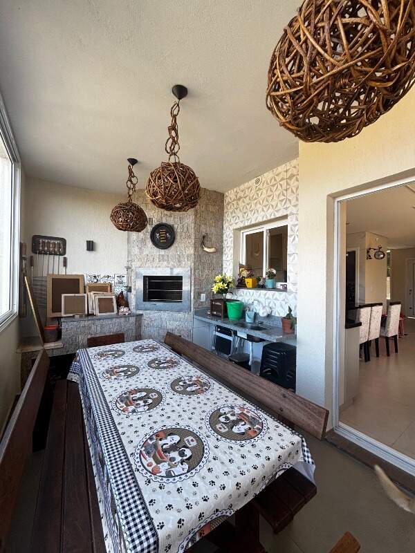 Na área social, destaca-se a sala de estar e jantar integradas à cozinha, que possui móveis planejados e lareira, proporcionando um ambiente aconchegante e funcional.