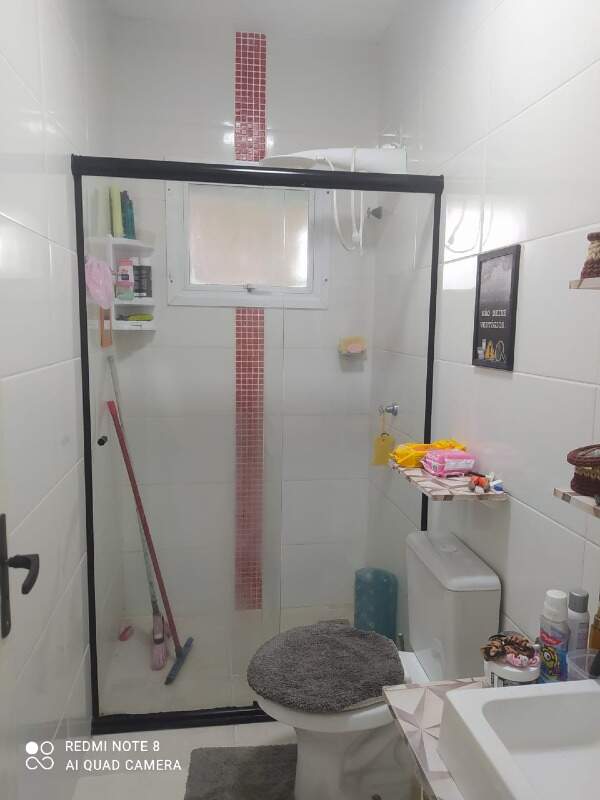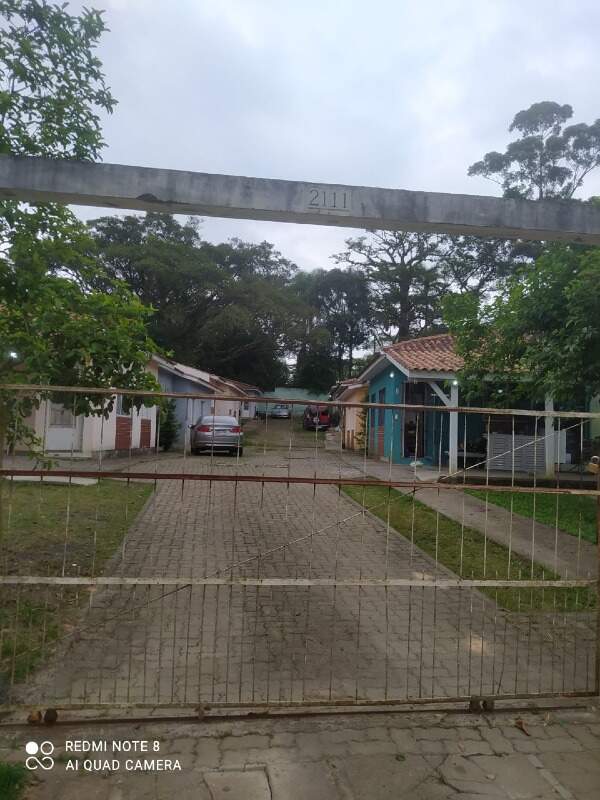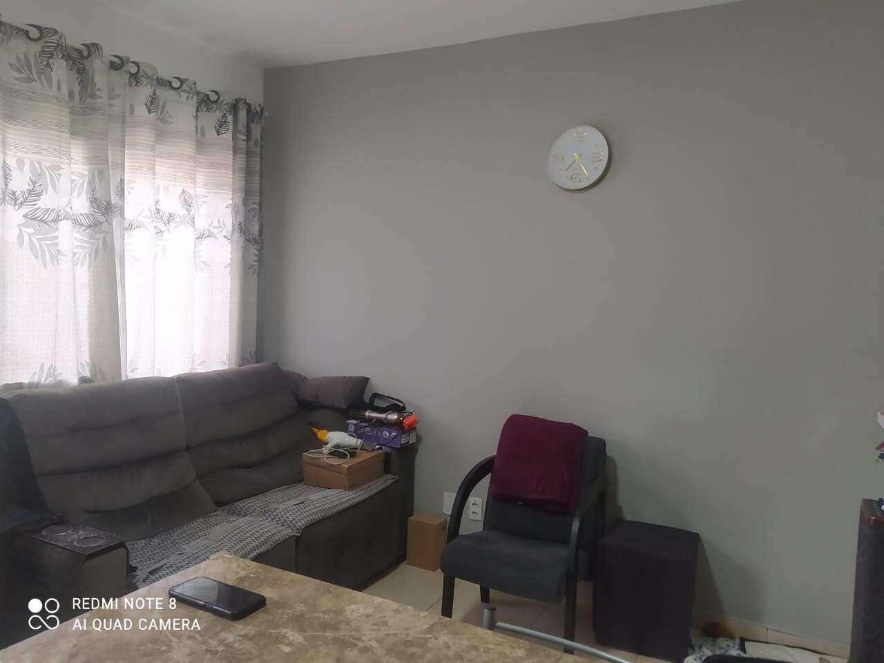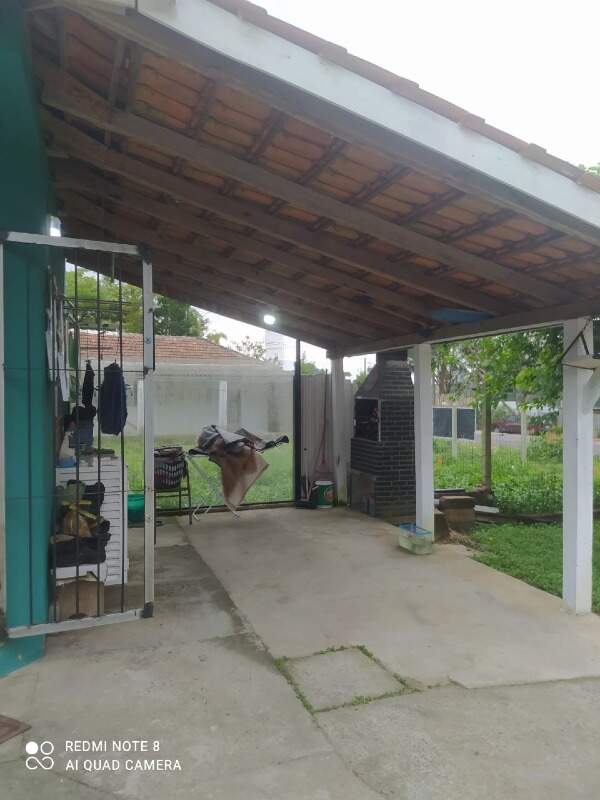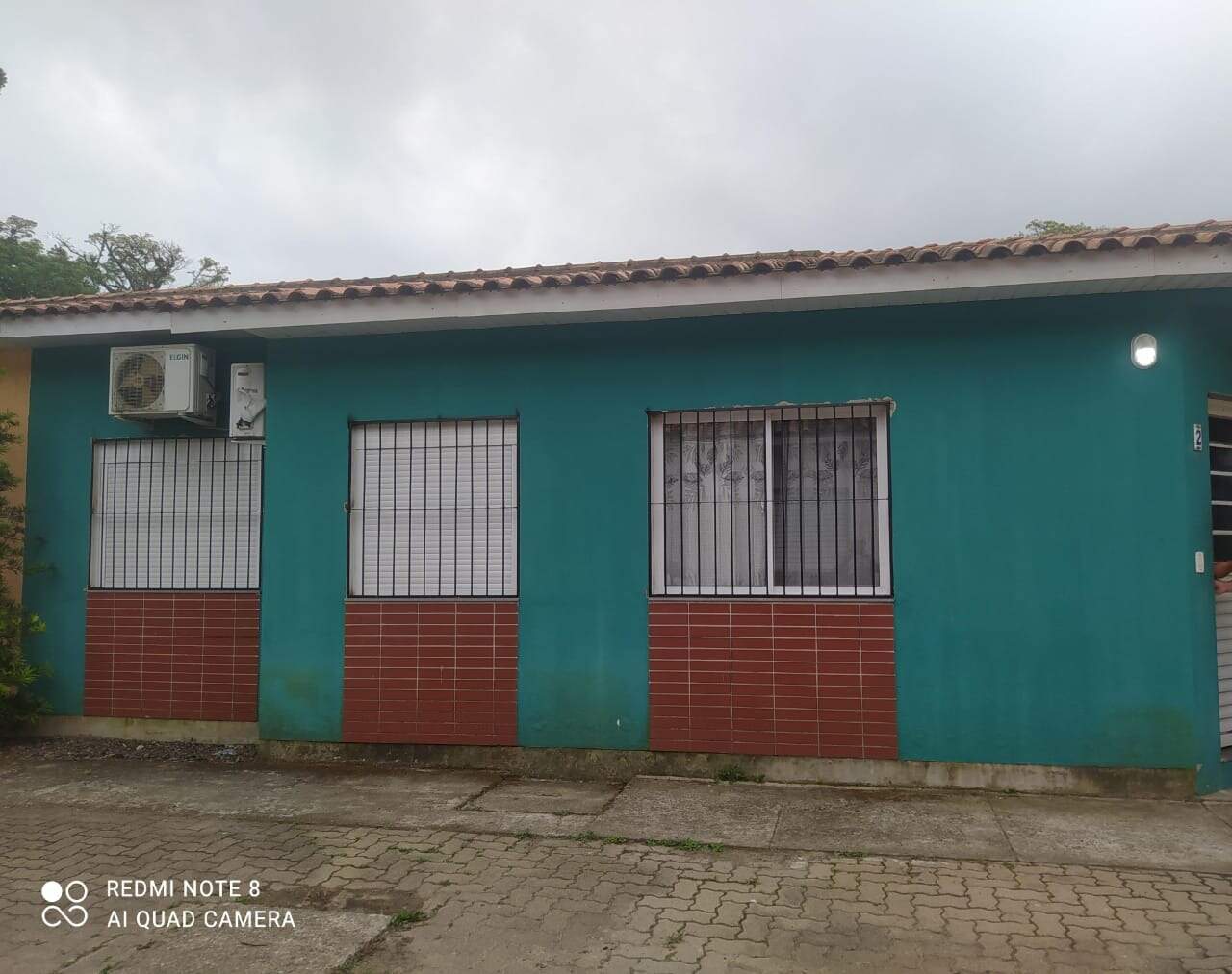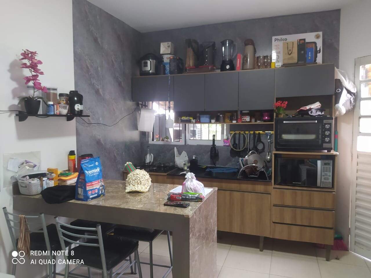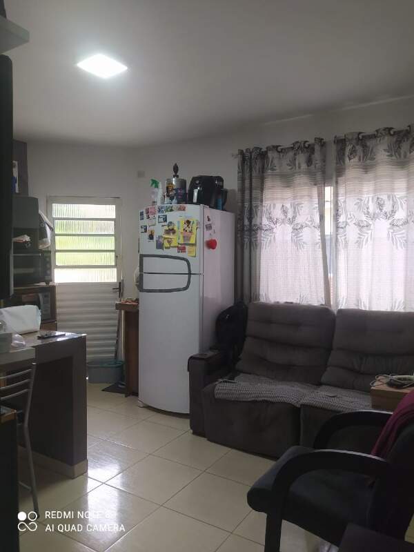 Casa térrea com 2 dormitórios, sala e cozinha americana, banheiro, área de serviço e uma vaga de garagem com churrasqueira.