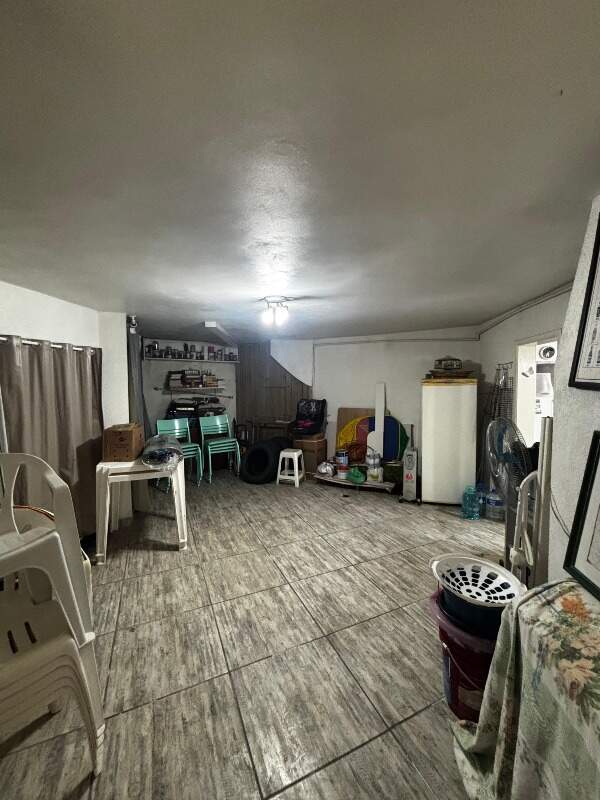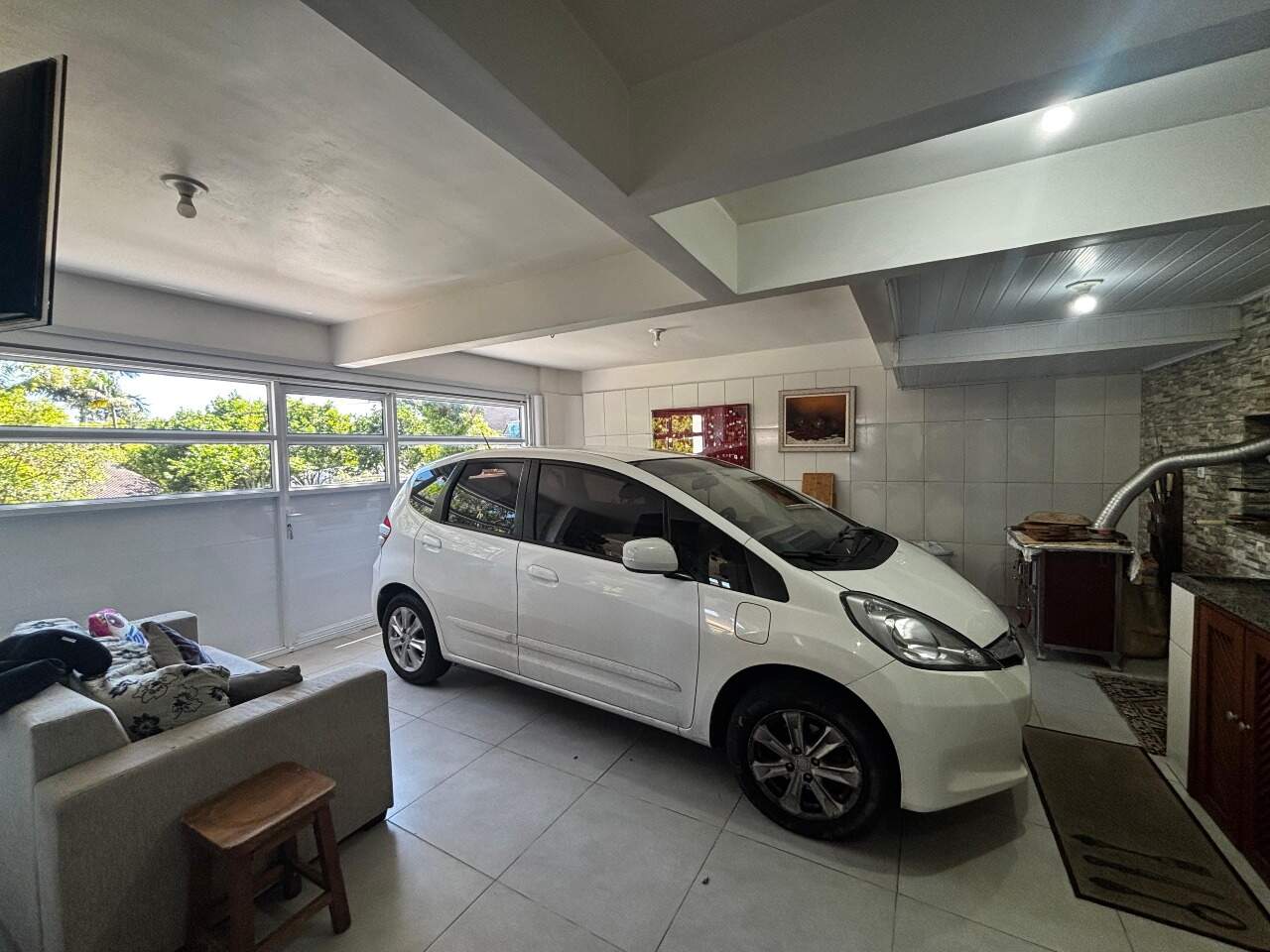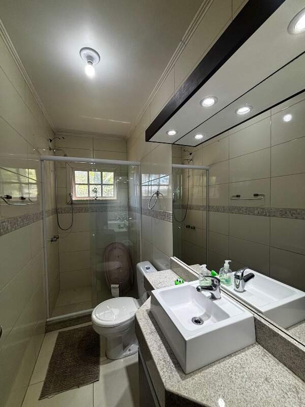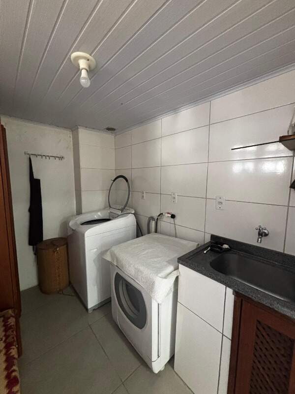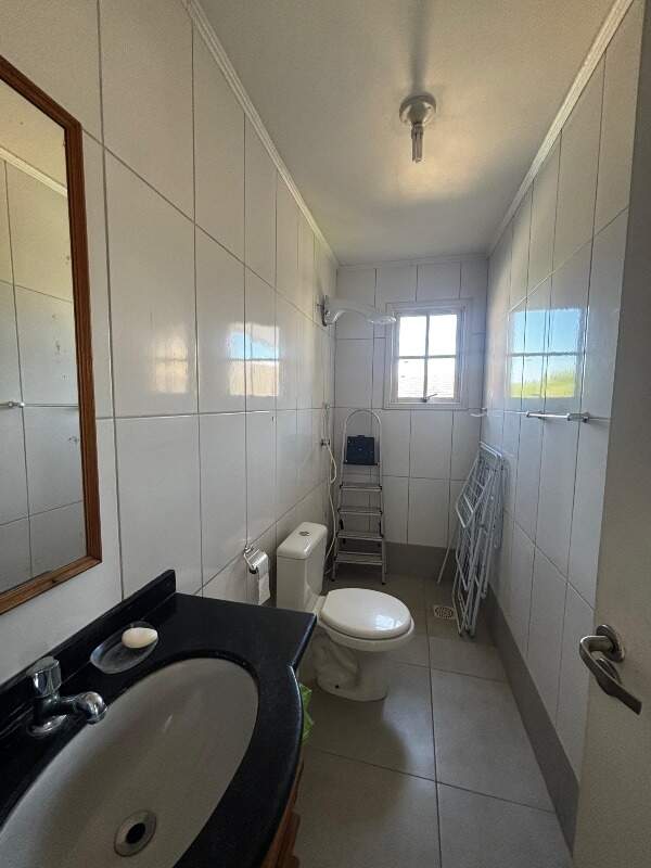 No andar inferior, o imóvel dispõe de 2 vagas de garagem cobertas, lavanderia fechada, área coberta para secagem de roupas, banheiro completo com chuveiro elétrico e amplo depósito.
