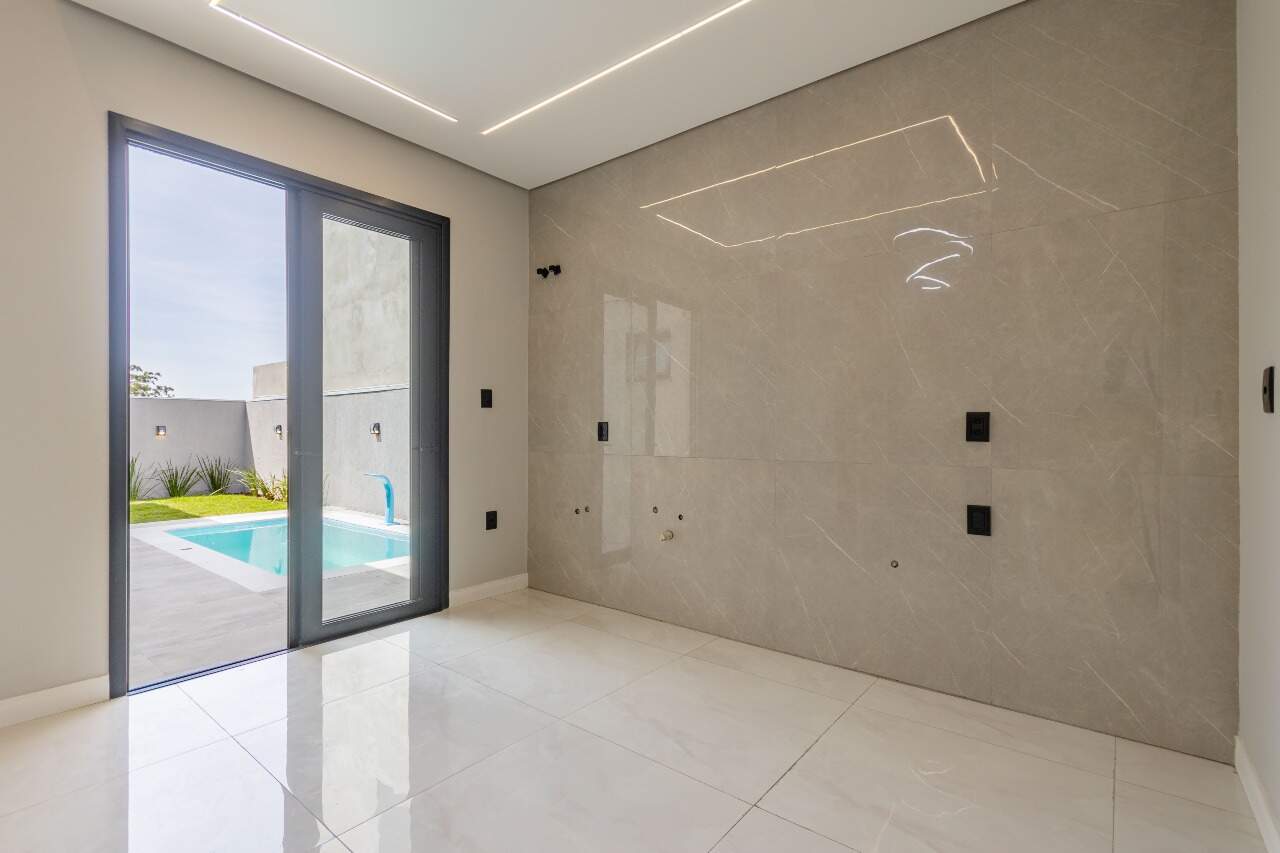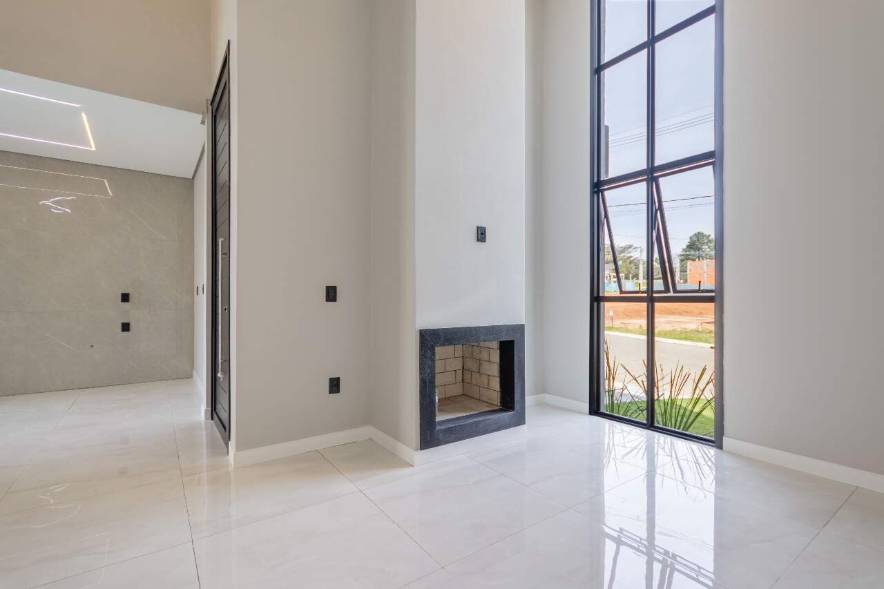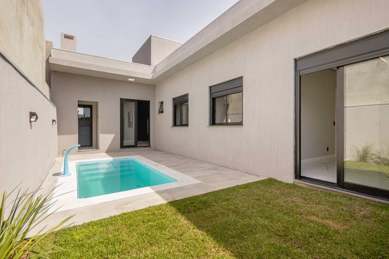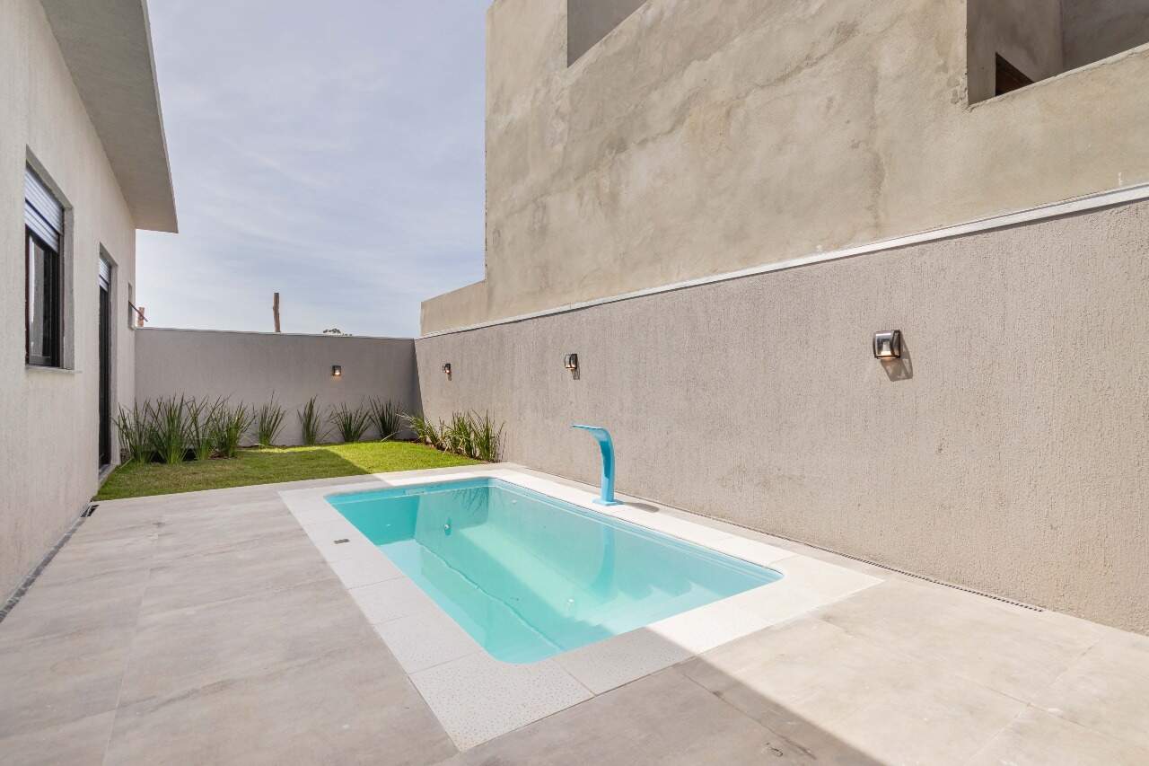 Assinado pelo arquiteto Daniel Cunha, o projeto oferece piscina 4m x 2m, três dormitórios sendo uma suíte com acesso direto para o pátio, segundo banheiro completo que atende como lavabo, lareira interna, pé-direito alto com iluminação natural privilegiada, churrasqueira integrada, paisagismo na fachada e varanda interna, iluminação instalada em toda casa, lavanderia e garagem coberta para dois carros.