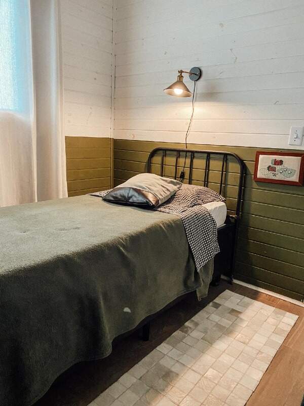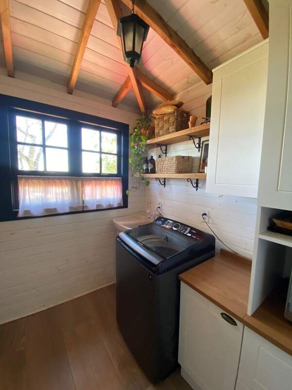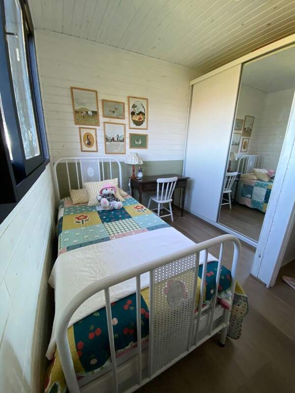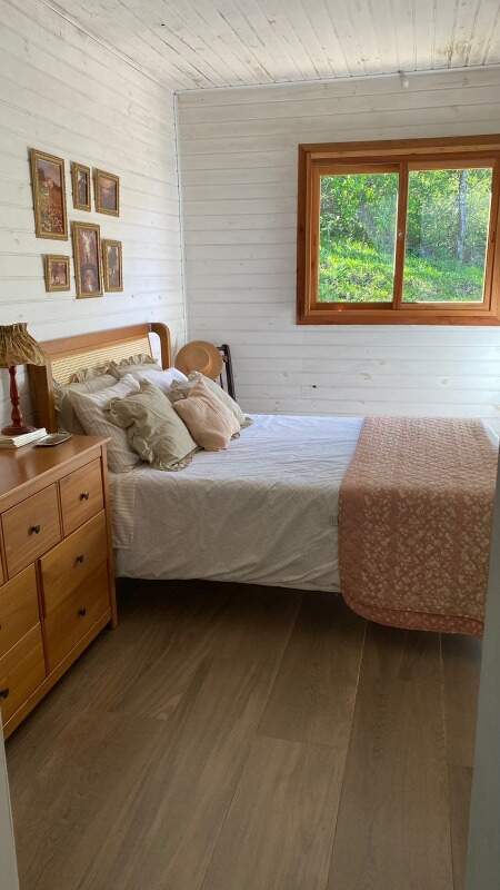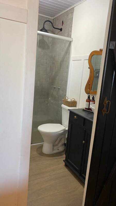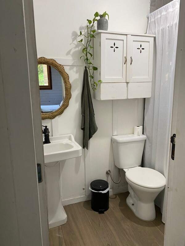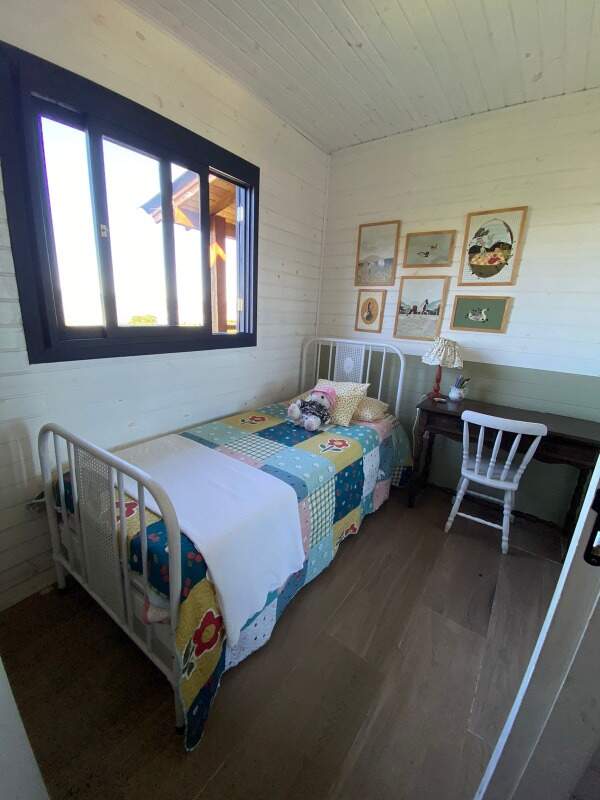 A casa principal, construída em madeira de ipê roxo, une charme rústico e conforto moderno. Conta com três dormitórios, sendo uma suíte, sala e cozinha integradas, fogão a lenha com dupla combustão, e cozinha planejada com móveis sob medida, tampo em quartzo e ilha em madeira de lei (garapeira).